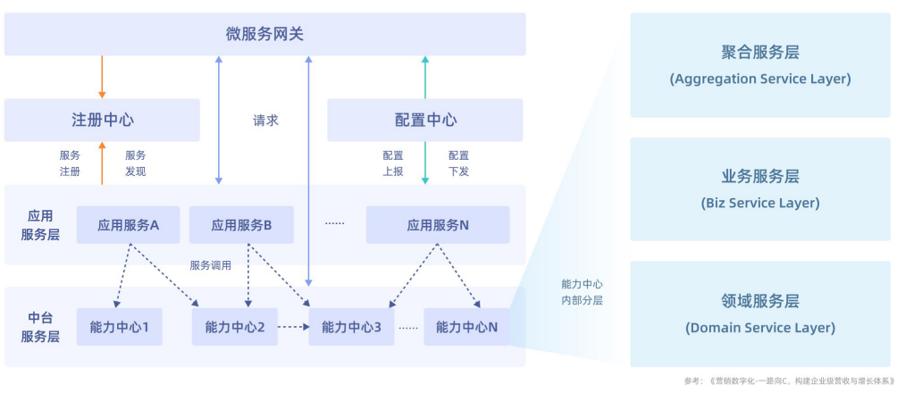 中台第一时间吸收了微服务按业务领域纵向分拆应用系统的方法,形成高内聚低耦合的能力中心。
