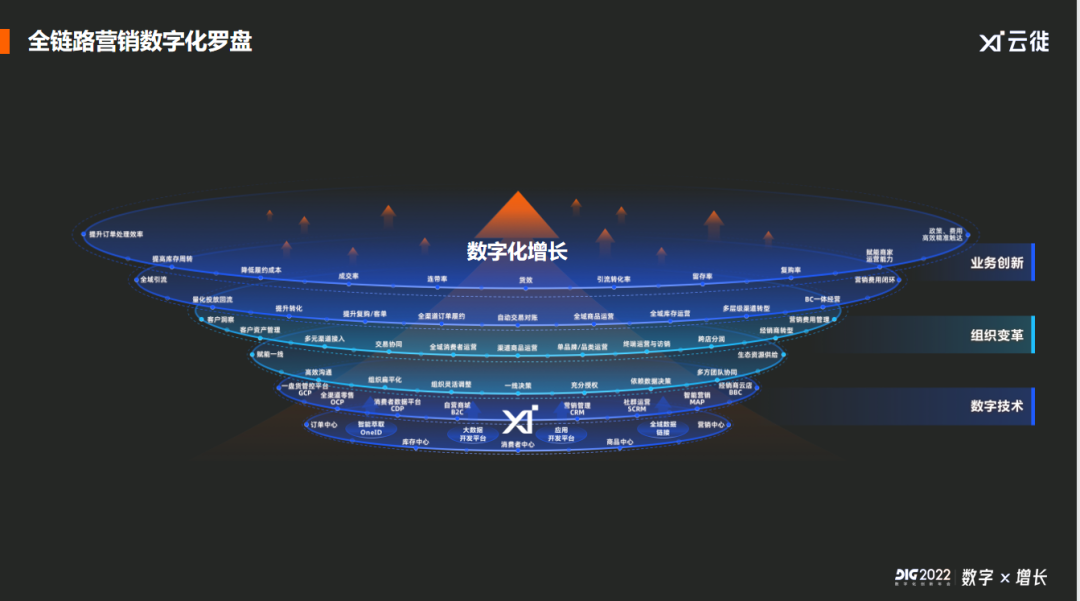 全链路营销数字化罗盘一共分成三层,最底层是数字技术,再向上是由数字技术驱动的组织变革,组织变革驱动的业务创新。