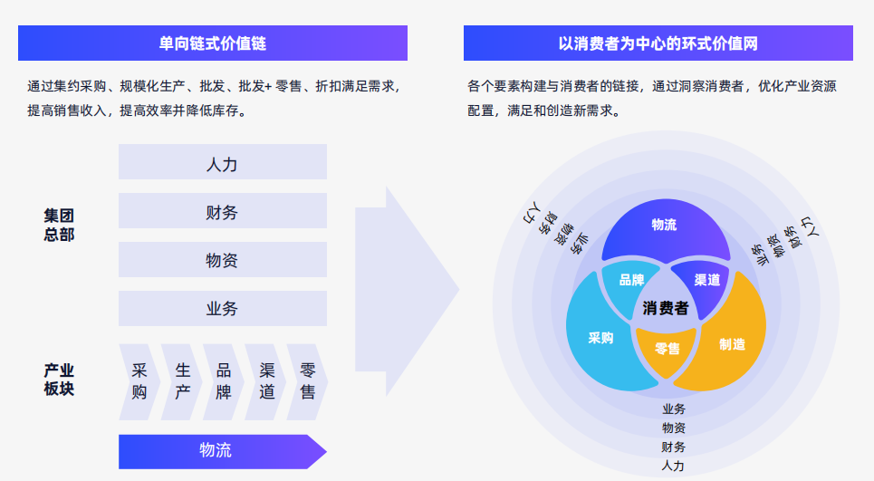 一:重新定义价值链,从以产品为中心的传统单向链式价值链重构为以消费者为中心的环式价值网;各个要素构建与消费者的链接,顺利获得洞察消费者,优化产业资源配置,满足和创造新需求。