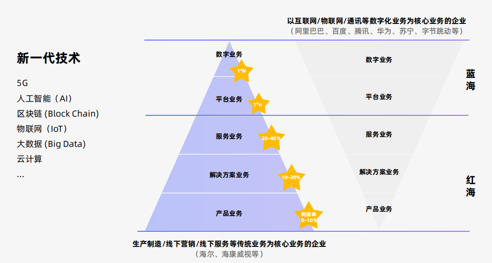 三:重新定义技术价值,从支撑企业业务优化提效进化为数字化业务创新,实现新增长。技术对企业的价值正在发生变化。以生产制造等线下业务为核心的传统企业,正在借助5G、人工智能、大数据、云计算等新一代技术,优化调整自身业务比重,从以往利润率低、红海竞争的产品、解决方案、服务业务,转向利润率高,且蓝海竞争的平台业务和数字业务,完成数字化转型。