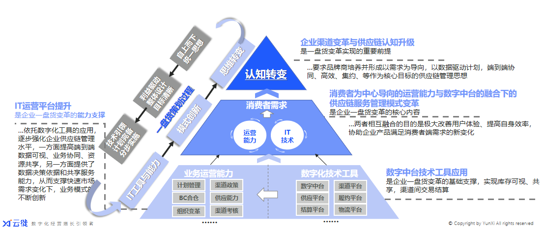 关键路径1:“一盘货”变革将是从业务与组织变革、模式设计到IT系统能力建设的持续优化过程,第一时间顺利获得顶层规划实现公司各事业部与渠道在认知上的转变。