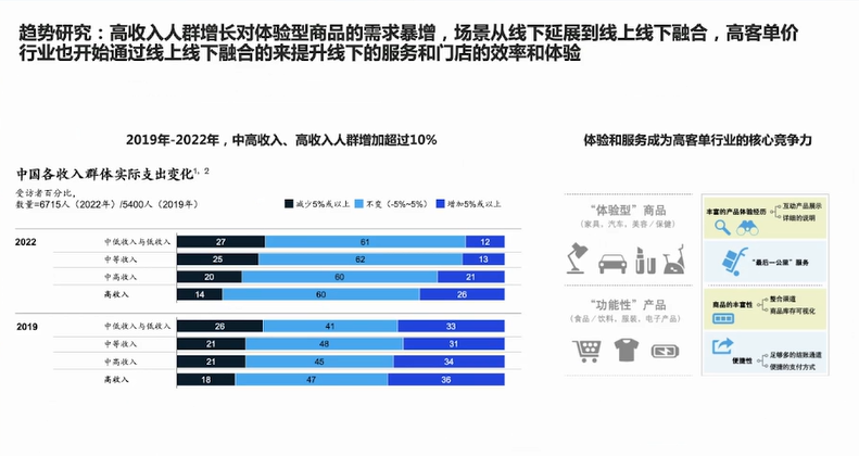 从趋势上看,疫情三年,中高收入和高收入人群在增长,低收入人群也在增长。也就是说,两极分化的情况会越来越明显。随着高收入人群的增长,体验型商品的需求也开始暴增。