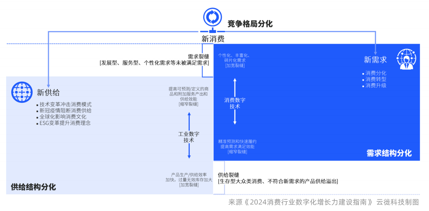 技术进步日益加速,促使消费产业需求和供给端都不断推陈出新,新技术加宽供需裂缝,需求和供给端的供需裂缝加大、更动态、变化更快,不确定性加大。消费数字技术加速了个性化、丰富化、碎片化需求,加宽了裂缝,另一方面,又精准预测和快速履约提高需求满足效能,缩窄了裂缝;而工业数字技术提高可预测/定义的商品和附加服务产出和供给效能,缩窄了裂缝,另一方面,产品生产/供给效率加快,过量无效库存加大,加宽了裂缝。这两个方面叠加,就出现了需求裂缝,即开展型、服务型、个性化需求等未被满足需求,以及供给裂缝,即生存型大众类消费、不符合新需求的产品供给溢出。
