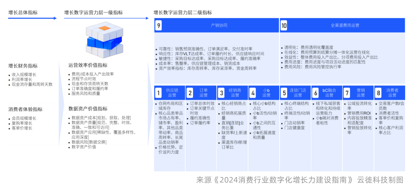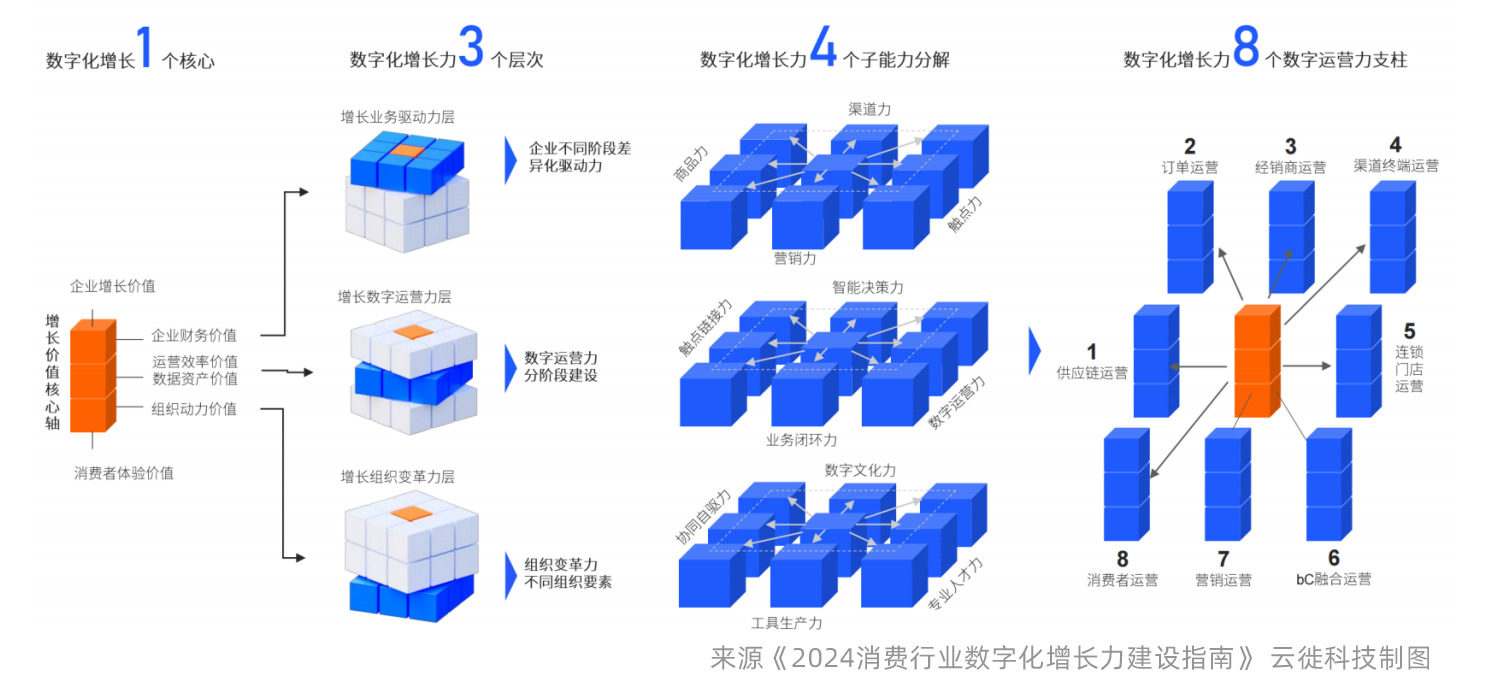 拆解数字化增长力魔方,围绕企业增长价值目标和消费者体验价值目标,即魔方核心轴,分解出“一核三层四梁八柱”对应到企业数字化增长力的三个层次八个运营级能力柱及数字化运营力建设四个阶段、组织变革力四个要素,业务驱动力四梁包括商品力、渠道力、触点力和营销力,数字运营力建设的四个阶段包括触点在线化、业务一体化、运营数字化和决策智能化,组织变革力四个要素包括工具生产力、数字人才、数据驱动文化和解耦生产关系,而从纵向拆解的八个能力柱均包含了这三个层次,八个能力柱包括了供应链运营、订单运营、经销商运营、渠道终端运营、连锁门店运营、bC融合运营、营销活动运营和消费者运营,企业可以按照这个模型去解构自身数字化增长力构建的节奏。