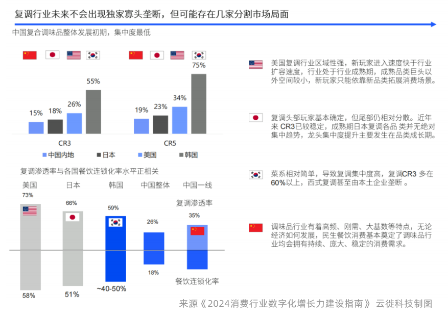 第一,从增长空间预测上看,我们分析发现,中国复调行业规模存在巨大增长空间,未来3年将保持12%以上复合增长率,现在行业集中度低,龙头企业并未取得压倒性优势,从国际市场对比看,复调行业未来不会出现独家寡头垄断,但可能存在几家分割市场局面。同时我们得出一个结论,美国、韩国和日本虽然菜系、国土面积分布、口味习惯、人口特征差异很大,头部玩家的集中度不同,但其头部玩家的核心差异化竞争力均在产品力上。