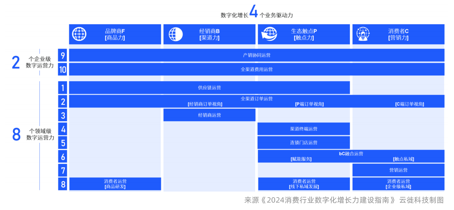 如果将四个驱动力分解在价值链前端,即成品出厂至消费者消费这一段,成对应的八个领域级数字运营力和两个企业级数字运营力,在落地层面顺利获得业数融合的数字化运营支撑四个驱动力能够在企业层面被各个部门协同实施推进落实。商品力可以拆解到供应链运营、全渠道订单运营、支撑产品研发的消费者运营,渠道力拆解到供应链运营、经销商订单运营、经销商运营,触点力拆解到P端订单运营、渠道终端小b运营、连锁门店运营、bC融合运营、线下私域运营,营销力才接到C端订单、bC融合运营、营销活动运营和企业级私域运营。而产销协同和全渠道费用运营是企业级数字运营能力,横跨了整体价值链。