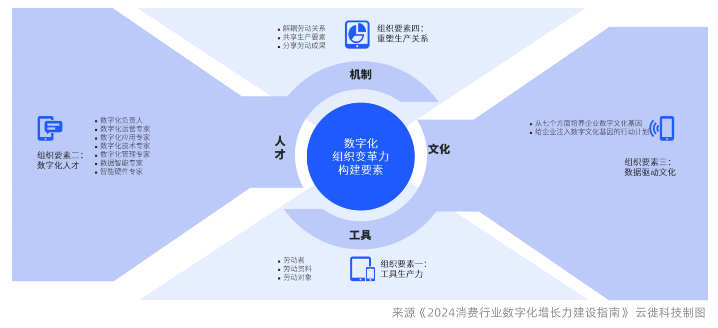 四个方面要素间是什么样的关系呢?工具生产力是基础,解决工具问题,在此基础上,人才和文化之间互相驱动,即顺利获得数字化人才和数据驱动文化,逐步达成生产关系重塑的目标,解决机制保障问题;而生产关系的重塑,即常规机制和权益机制保障,又反向促进协同团队快速组建、人才快速引入,以及数据驱动文化的成效体现,并对工具里的数据等形成反向增强需求。因此这四个方面是不可分割的相互促进的四个方面。