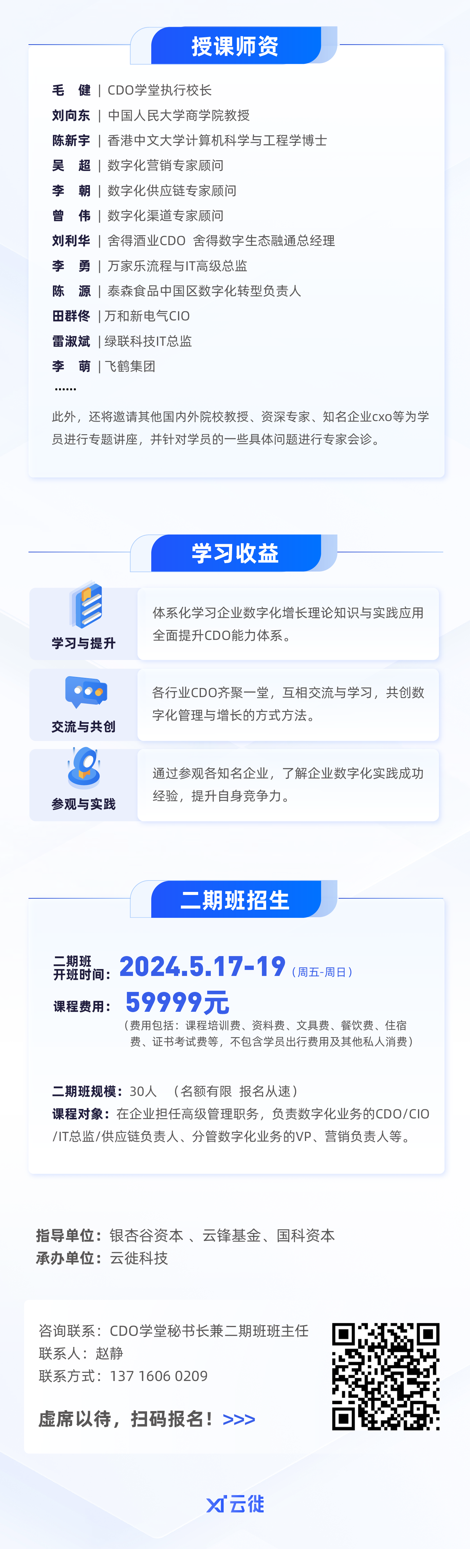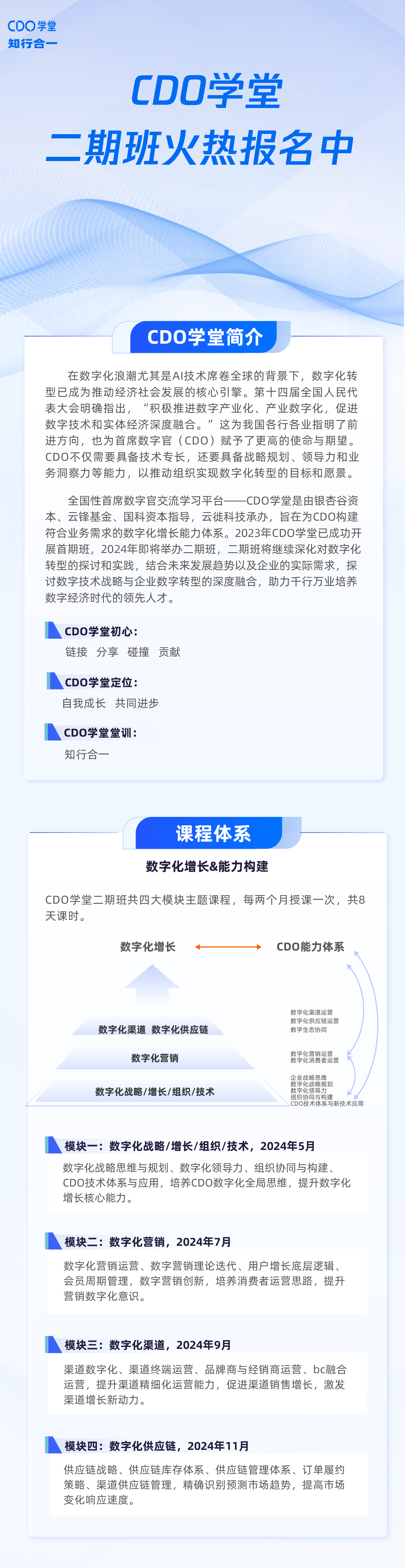 2024年,CDO学堂二期班将继续深化对数字化转型的研究与实践,紧密结合未来国家开展趋势及企业的实际需求,深入探讨CDO的成功之道,持续为企业CDO构建符合业务需求的数字化经营能力体系,助力千行百业培养数字经济时代的全球数字领军人才。